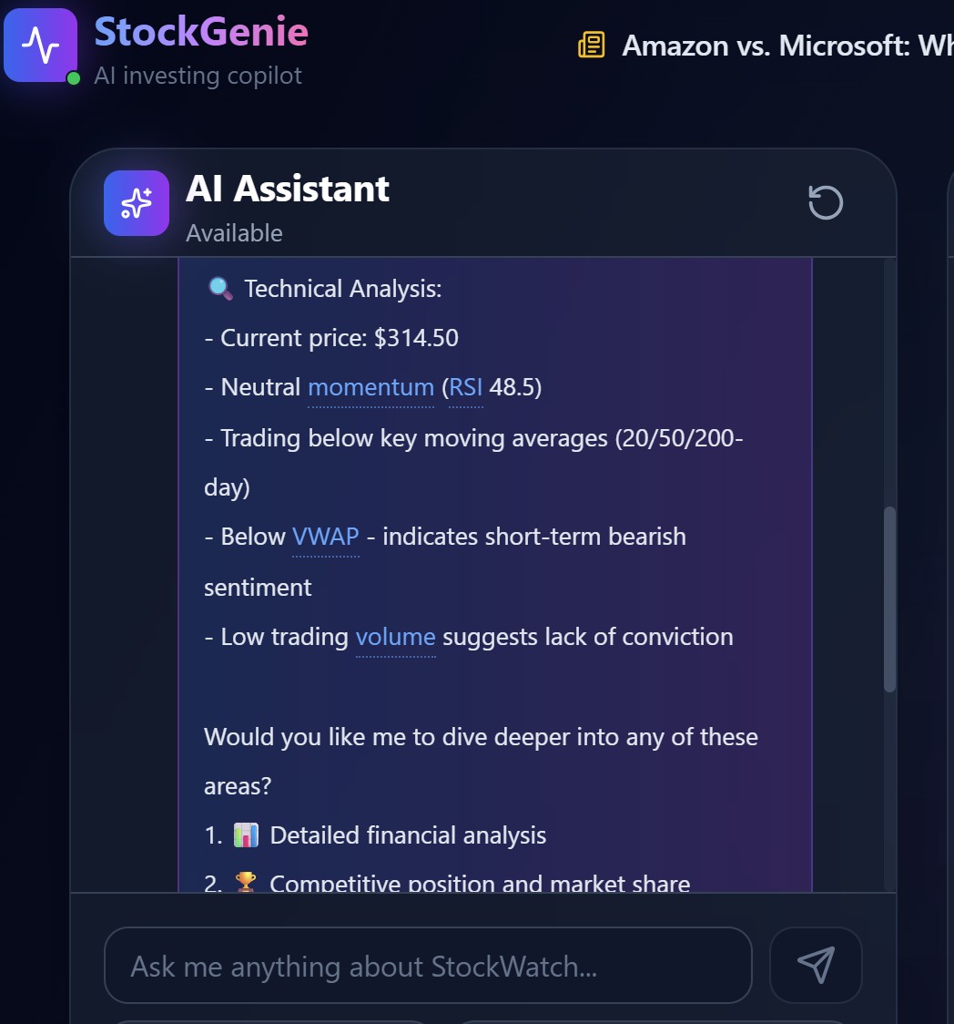It's not generic chat that hedges everything with "I can't give financial advice." It's a specialized tool that does one thing well: help you understand stocks faster.
