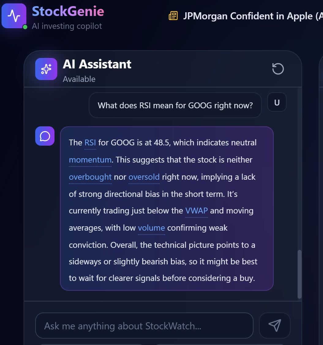 It didn't give me a textbook definition. It explained what RSI is, what GOOG's current RSI reading means, and what that typically signals - all in the context of the stock I was actually looking at.